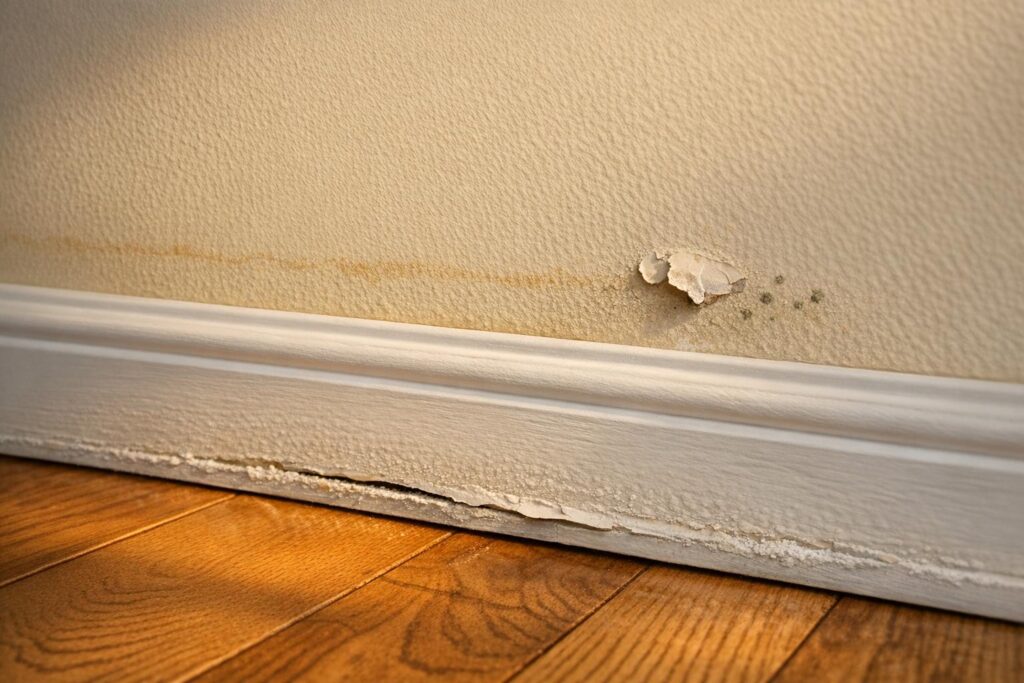 Water tends to follow the edges where floors meet walls. Check your baseboards for swelling, peeling paint, or horizontal discoloration – these "tide lines" are a telltale sign of water infiltration. Press along the baseboards to feel for any soft or weakened areas.
