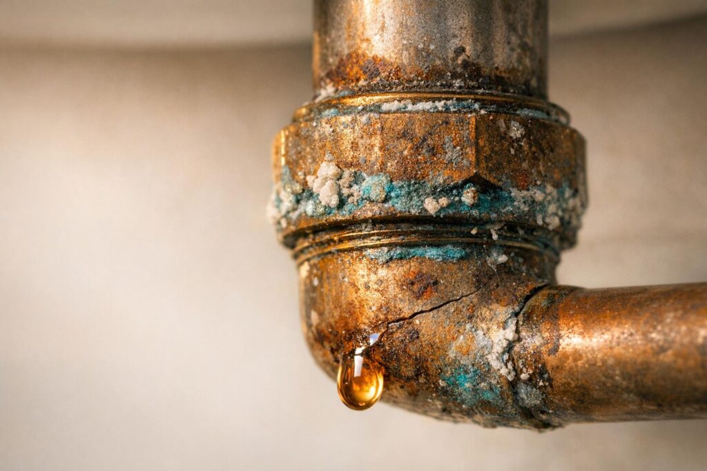 - Visible Corrosion: Rust, green stains, or swelling on pipes indicate advanced damage.